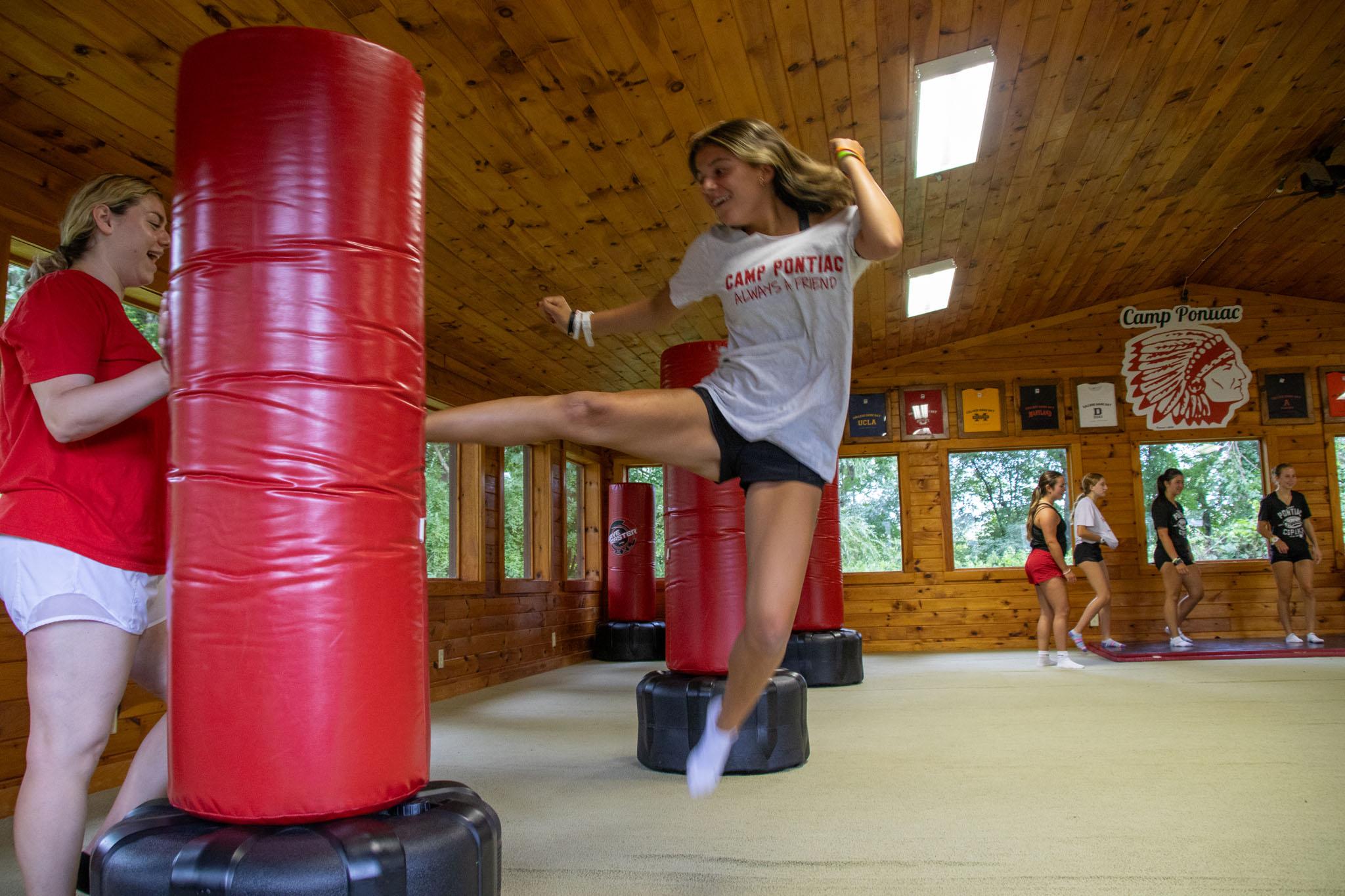 Martial Arts at Camp Pontiac! Our New York summer camp's mixed martial program arts is housed in an air-conditioned pavilion with an Olympic-sized spring floor. Boys and girls are welcome to try their hands (and feet!) in the art of self-defense no matter their skill level while here at sleep away camp. The program's two instructors differentiate the pace of lessons based on our campers’ individual abilities. The pavilion’s spring floor also lends itself to be the grounds for our New York camp’s basic gymnastics classes.